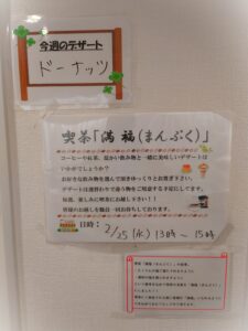 本日は満福喫茶 2026年2月25日 最終更新日時 : 2026年2月25日 info@laluzfeliz.com いつもラ・ルス・フェリス茨木のホームページをご覧下さりありがとうございます。 本日は喫茶でした(*^▽^*)